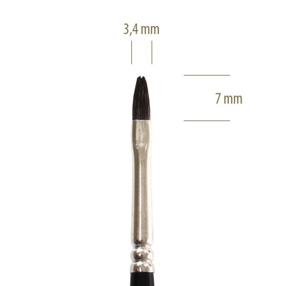 Pincel língua de gato, feito de pelo natural de esquilos, com virola de metal e cabo curto cilíndrico em madeira.
