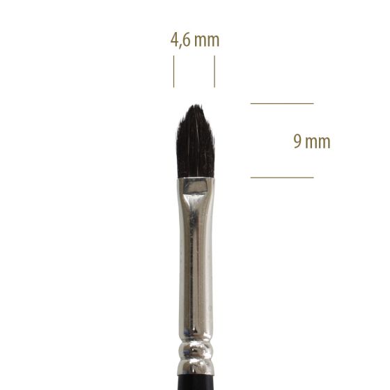 Pincel língua de gato, feito de pelo natural de esquilos, com virola de metal e cabo curto cilíndrico em madeira.