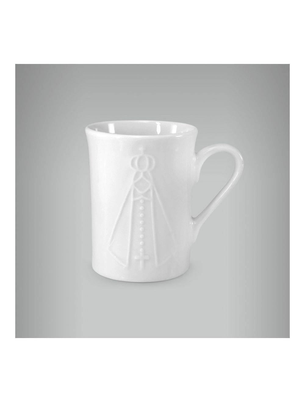 Caneca de porcelana branca com imagem santa de Nossa Senhora Aparecida em relevo