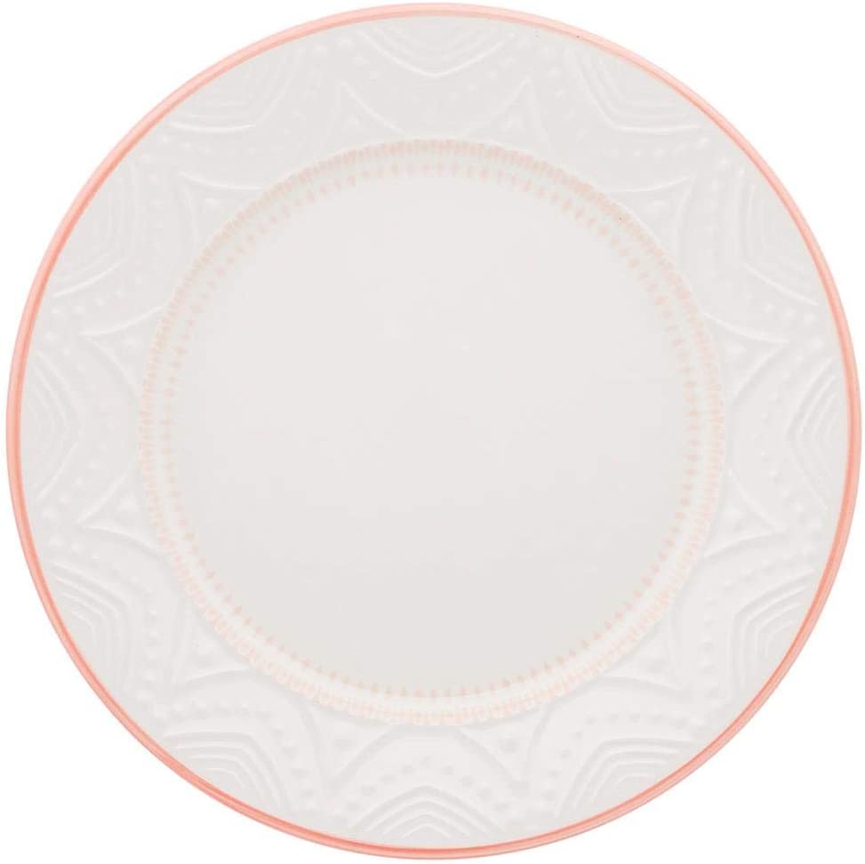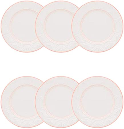 Kit / conjunto de seis pratos de cerâmica da linha sweet. Eles são da cor marfim com a borda cor de rosa.