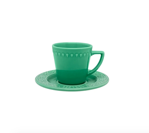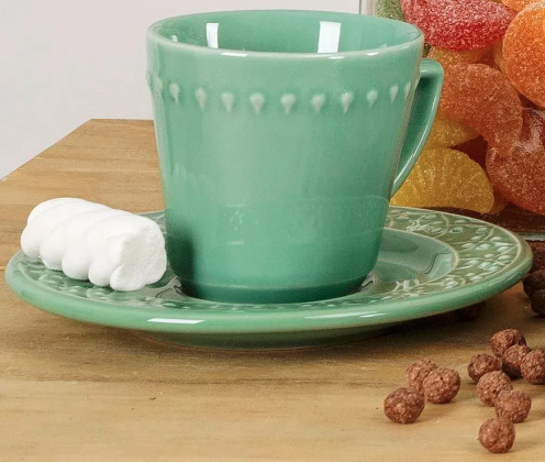 As Xícaras com pires Sálvia é uma elegante peça de cerâmica apreciada por sua beleza e durabilidade. Fabricada a partir de argila de alta qualidade, a porcelana é cuidadosamente moldada e queimada a altas temperaturas para criar uma superfície lisa e brilhante. Com sua aparência clássica e design versátil, a xícara de porcelana é um item essencial na hora de desfrutar de bebidas quentes ou frias. Seja no café da manhã ou durante uma reunião sofisticada, esta xícara proporciona uma experiência única de degustação, tornando cada gole uma verdadeira delícia. Adquira as suas Xícaras com pires Sálvia e desfrute de momentos especiais com estilo e qualidade incomparáveis.