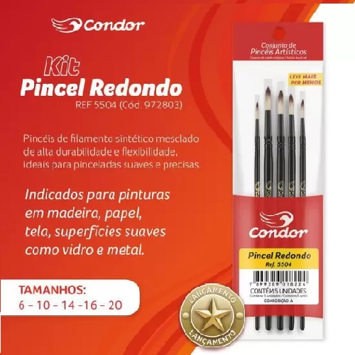 Contém 5 pincéis com os seguintes tamanhos: 6, 10, 14, 16 e 20.