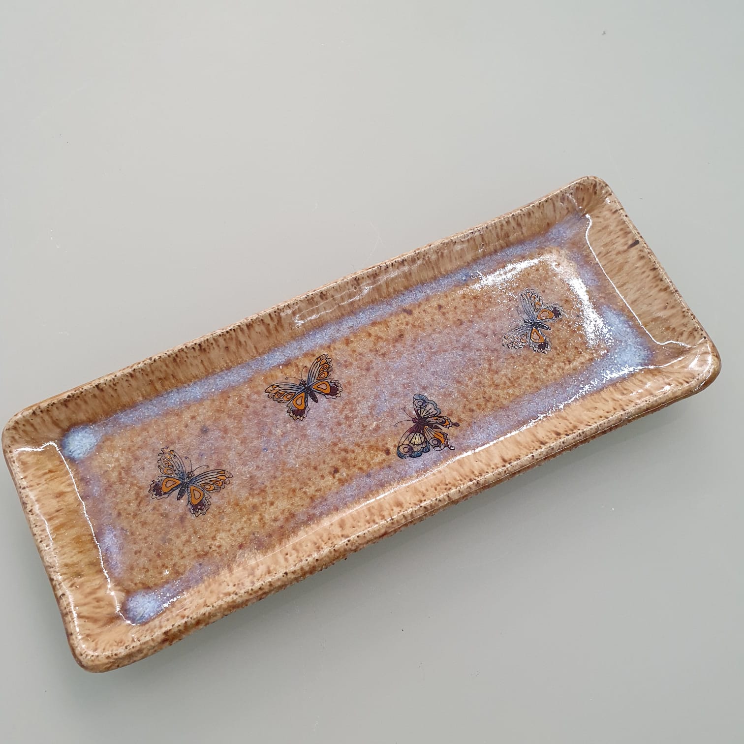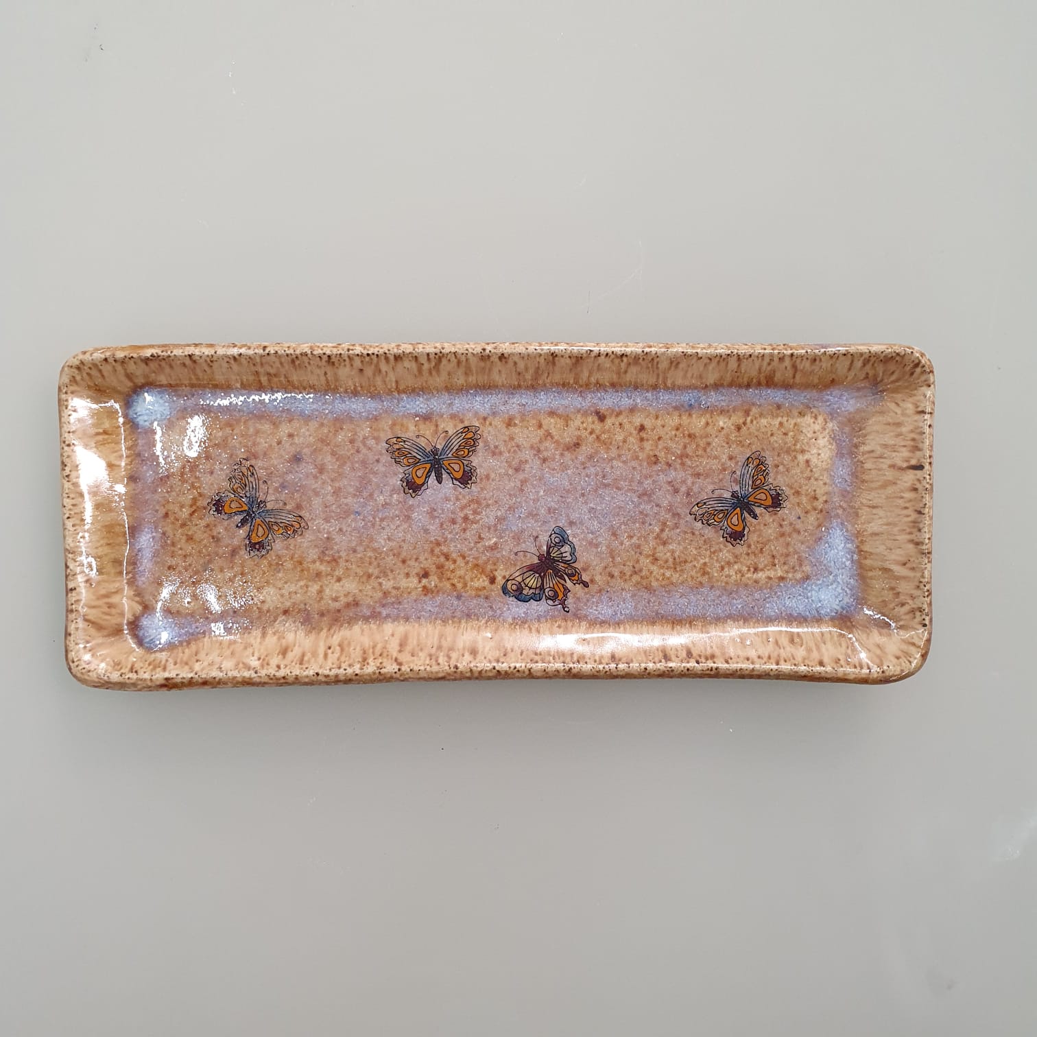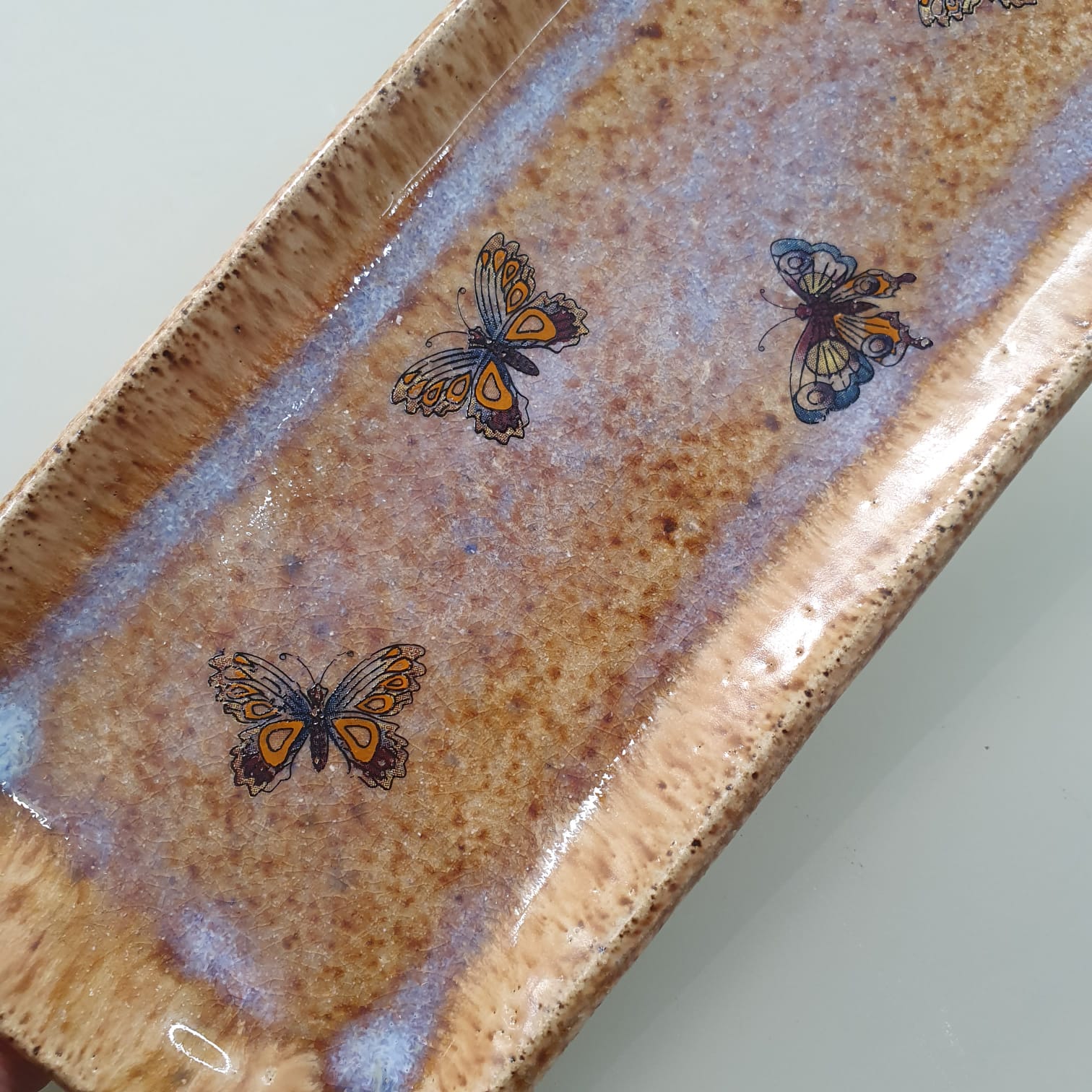 Prato retangular de cerâmica artesanal com detalhe de borboletas. Peça única.