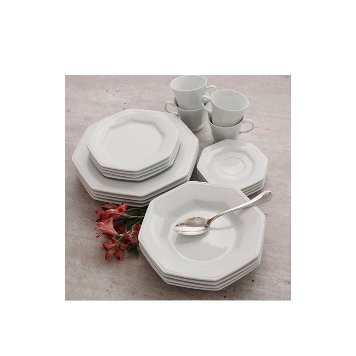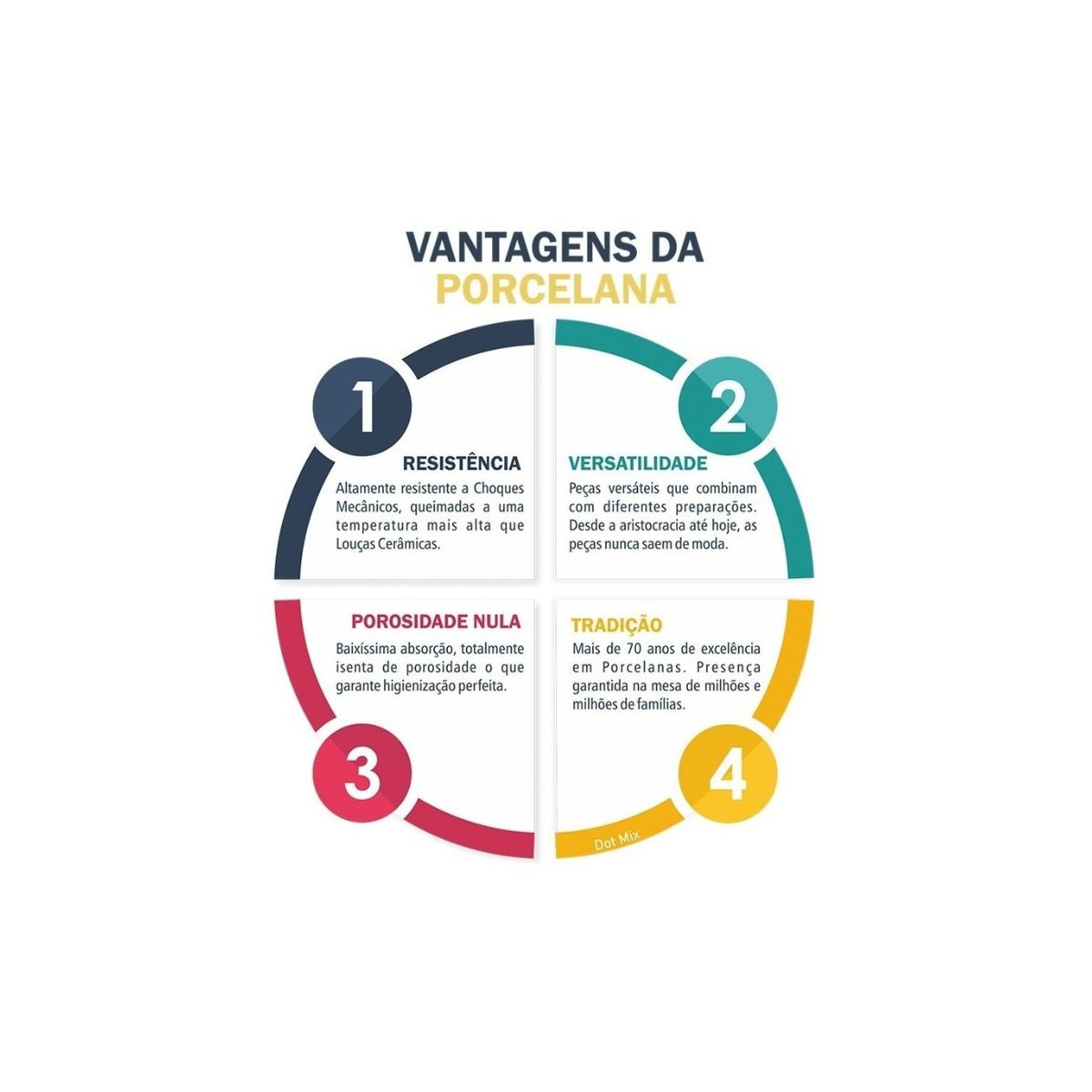 Porcelana de alta qualidade com porosidade nula, garantindo perfeita higienização e resistência a choques mecânicos. Peças como acabamento um Resistente Esmalte que pode ser submetido ao efeito abrasivo da lava-louças e a utilização em micro-ondas.
